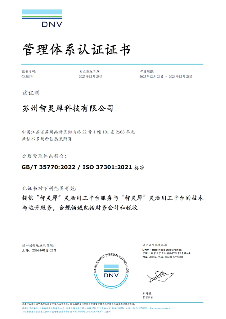 本次认证范围为智灵犀灵活用工平台服务与智灵犀灵活用工平台的技术与运营服务,合规领域包括财务会计和税收。通过此次ISO 37301审核并获得证书,标志着智灵犀在对应的合规领域已建立起一套符合国际认证标准的管理体系,展现了企业主动合规经营,致力于良好治理、透明度和可持续发展的积极态度。