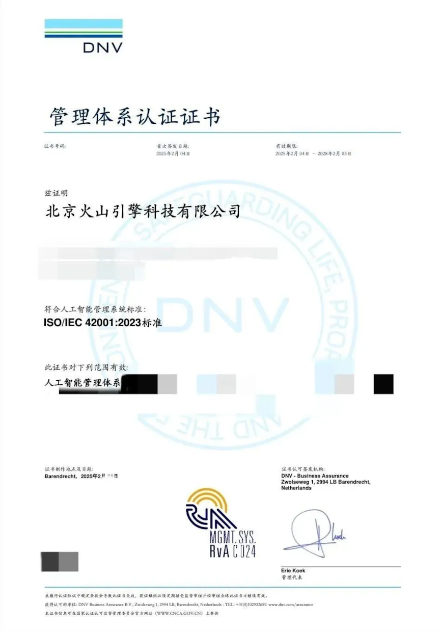 2025年2月4日,火山引擎正式通过国际权威认证机构 DNV 的严格审核,成为全球首批通过荷兰认可委员会(RVA)认可的认证机构审核,获得 ISO/IEC 42001:2023 人工智能管理体系认证的企业之一。这标志着火山引擎在 AI 治理领域的技术实力与合规能力达到国际最高标准。