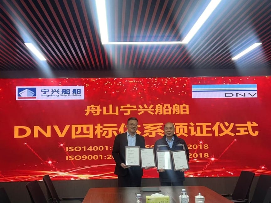 近日,舟山宁兴船舶修造有限公司(以下简称“舟山宁兴船舶”)成功通过 ISO 9001 质量管理体系、ISO 14001 环境管理体系、ISO 45001 职业健康与安全管理体系以及 ISO 50001 能源管理体系认证,并正式获得 DNV 颁发的认证证书。这也是舟山市岱山地区的船厂中第一家同时完成四标体系认证的公司。这一里程碑式的成果标志着舟山宁兴船舶在管理规范化、标准化和可持续发展道路上迈出了坚实而重要的一步。
