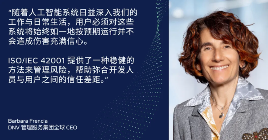 “我们非常自豪地宣布,我们获得了 RvA 的认可,成为全球首批获得此项认可的国际认证机构之一。ISO/IEC 42001 标准认证对于组织采用稳健的流程治理以确保安全、可靠和合乎道德地开发、实施和使用人工智能至关重要。” DNV 管理服务集团全球 CEO,Barbara Frencia 表示。