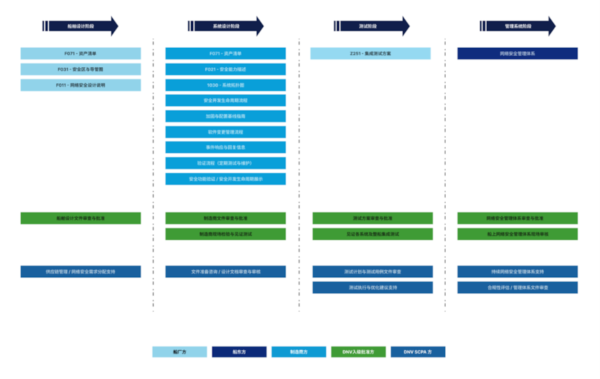 DNV 全程监督船舶网络安全实施的各关键阶段,涵盖设计(船舶/系统)、实船测试及管理体系验证环节,包含各系统及整船的测试,确保网络安全功能在实船条件下能够有效运行,并行使最终审查与批准权。船厂及设备制造商需在过程中配合提交所需对技术文档与图纸,例如资产清单(F071)、安全区域与导管图(F031)、以及网络安全设计说明(F011)等。