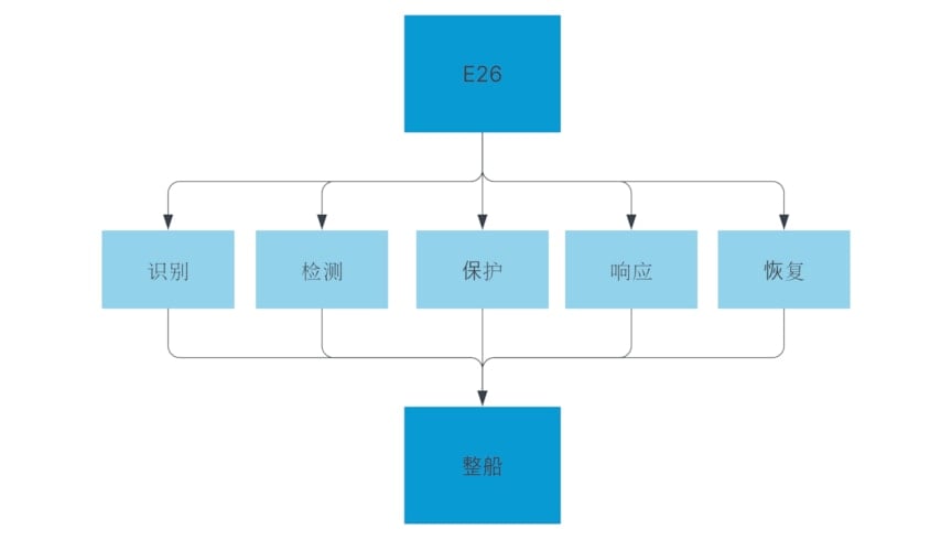 E26 聚焦整船网络安全,围绕“识别、保护、检测、响应、恢复”五大能力,覆盖船舶从设计建造到交付与全生命周期运行。
